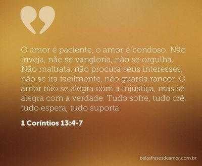 O amor é paciente, o amor é bondoso. Não inveja, não se vangloria, não se orgulha. Não maltrata, não procura seus interesses, não se ira facilmente, não guarda rancor. O amor não se alegra com a injustiça, mas se alegra com a verdade. Tudo sofre, tudo crê, tudo espera, tudo suporta. (1 Coríntios 13:4-7)