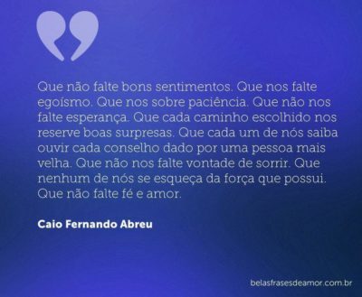 Que não falte bons sentimentos. Que nos falte egoísmo. Que nos sobre paciência. Que não nos falte esperança. Que cada caminho escolhido nos reserve boas surpresas. Que cada um de nós saiba ouvir cada conselho dado por uma pessoa mais velha. Que não nos falte vontade de sorrir. Que nenhum de nós se esqueça da força que possui. Que não falte fé e amor.