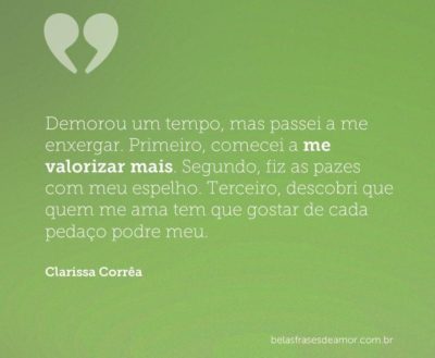 Demorou um tempo, mas passei a me enxergar. Primeiro, comecei a me valorizar mais. Segundo, fiz as pazes com meu espelho. Terceiro, descobri que quem me ama tem que gostar de cada pedaço podre meu.